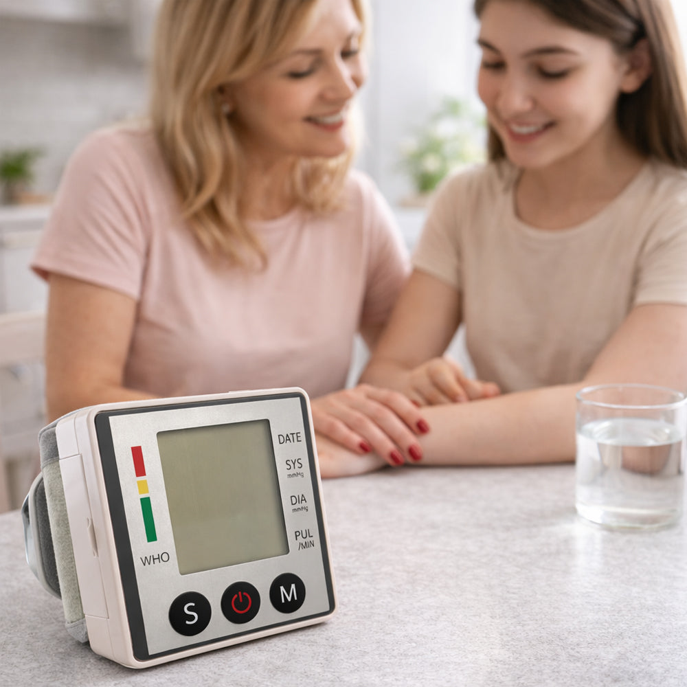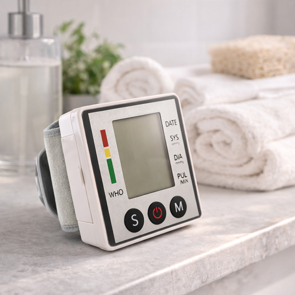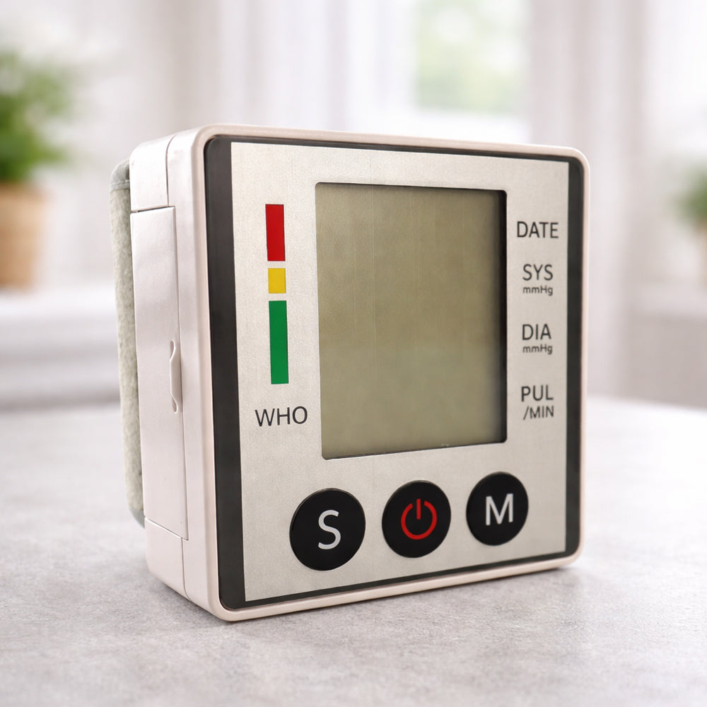 Med denna elektroniska blodtrycksmätare för handleden kan du enkelt hålla koll på ditt blodtryck hemma. Den kompakta mätaren ger snabba och precisa mätningar direkt på handleden och visar resultaten tydligt på den stora LCD-displayen.