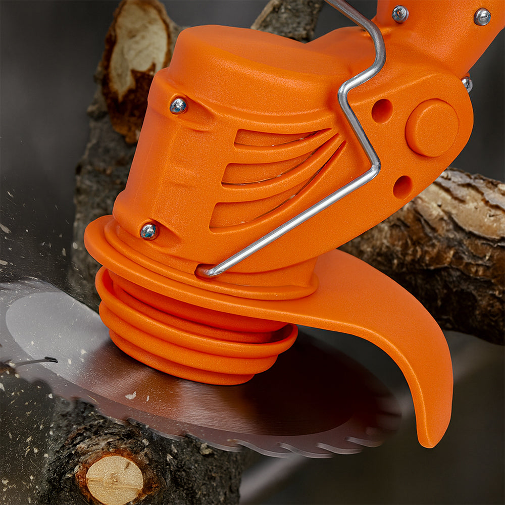 De medföljande utbytbara klingorna ger full flexibilitet: använd plastklingor för vanligt gräs, metallklingor för tät växtlighet och den cirkulära sågklingan för tjockare grenar och buskar.
