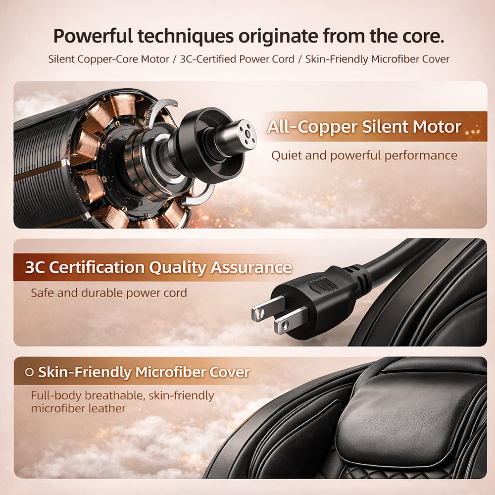 Med Zero Gravity-läget placeras kroppen i en ergonomisk, nästan viktlös position där benen höjs lätt över hjärtnivå. Det minskar belastningen på ryggraden och ger en djupare och mer avslappnande massage – perfekt för stressreducering, vila och powernaps.