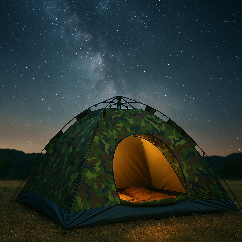 Ge dig ut på äventyr utan krångel! Detta camouflagemönstrade quick-up-tält är skapat för campare, festivalbesökare och naturälskare som vill lägga tiden på upplevelser – inte på att sätta upp tält.