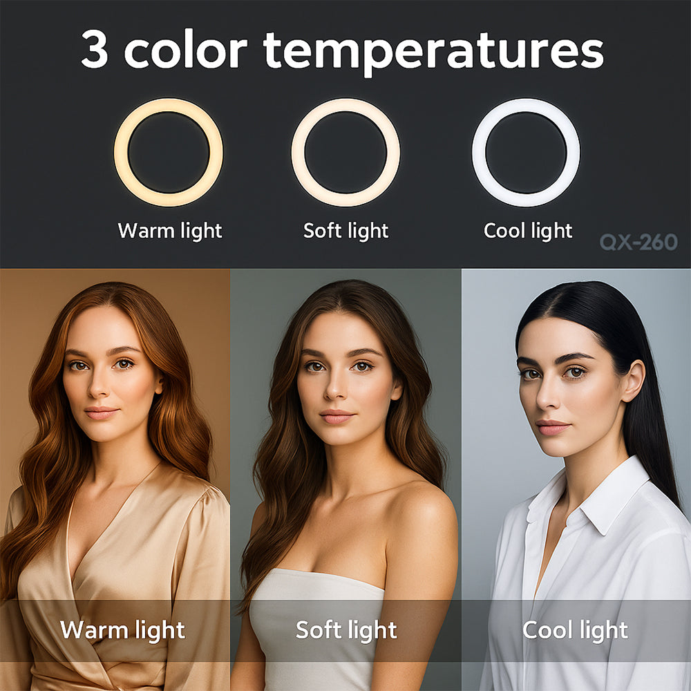 Ringlampan har 3 ljuslägen (kallt, varmt och mjukt ljus) samt steglös justering av ljusstyrkan. Du kan enkelt anpassa ljuset efter omgivningen och få det mest naturliga utseendet – utan behov av extra filter.