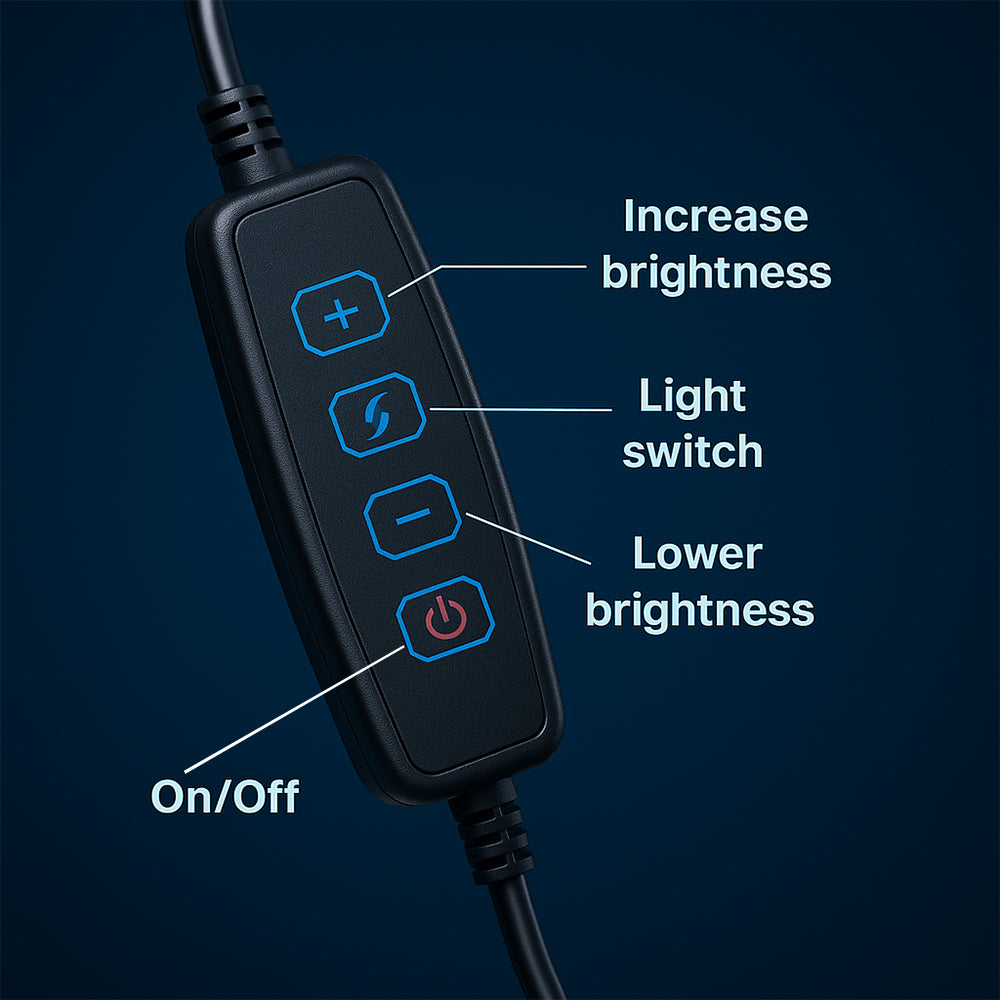 Med den inbyggda USB-kabelkontrollen kan du slå på/av, byta ljusfärg och justera ljusstyrkan med ett enkelt tryck. Praktiskt och snabbt – perfekt för både nybörjare och proffs.