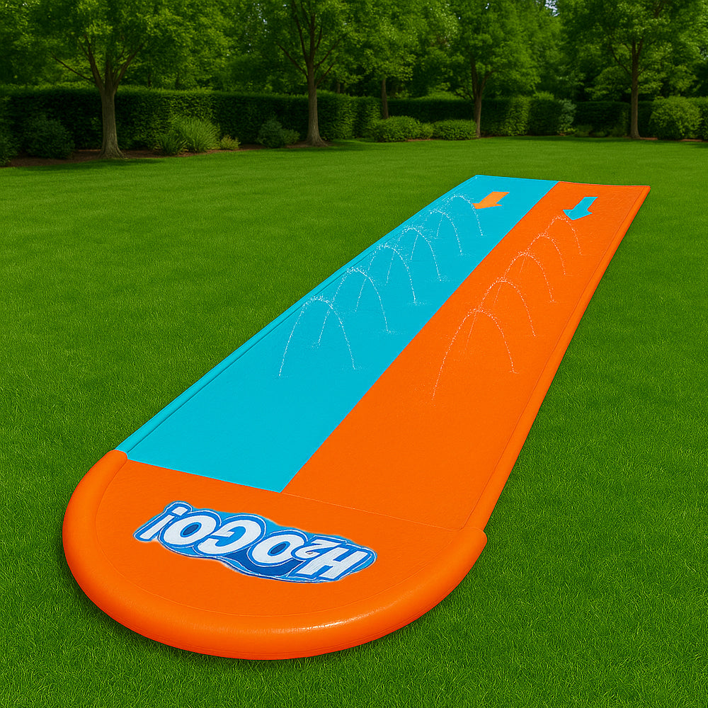 Förvandla trädgården till ett vattenland en varm sommardag - koppla bara på trädgårdsslangen, hoppa in i ett par badbyxor och det blir garanterat flera timmars nöje och kul för alla vattendjur i familjen! Här får du en stor rutschkana som har en längd på hela 488 cm.